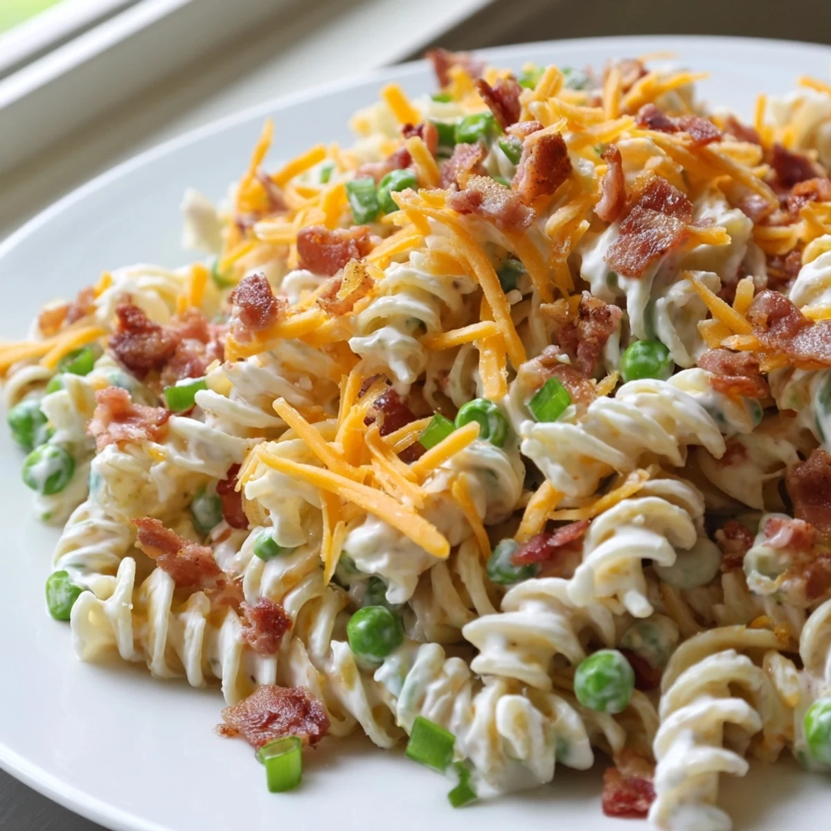 My sister brought this pasta salad to a backyard BBQ last summer, and I honestly hovered near the bowl the entire afternoon. Something about that creamy ranch coating clinging to every curly rotini noodle, the way the sharp cheddar and salty bacon bits tangle together with sweet green peas.
