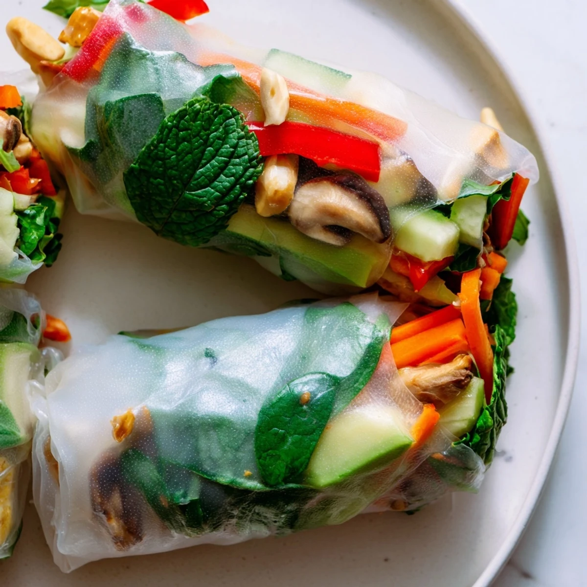 Julienned carrots, cucumber, and bell pepper provide excellent crunch and vibrant color. Baby spinach or butter lettuce adds soft texture. Other great options include shredded cabbage, snap peas, bean sprouts, sliced radishes, or mango for sweetness. Choose vegetables that can be cut into thin strips and maintain texture when wrapped. Avoid overly watery vegetables that might make rice paper soggy.
