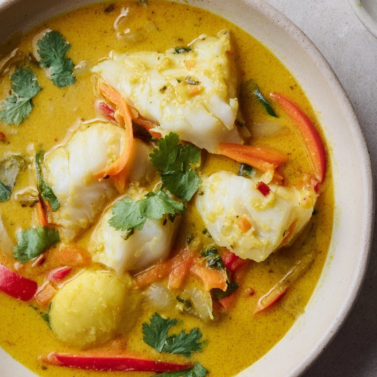 This aromatic coconut fish stew combines tender chunks of white fish with a medley of fresh vegetables in a rich, creamy coconut broth. The dish balances the delicate sweetness of coconut milk with warm spices like turmeric and coriander, while fresh ginger, garlic, and lime add bright, zesty notes.