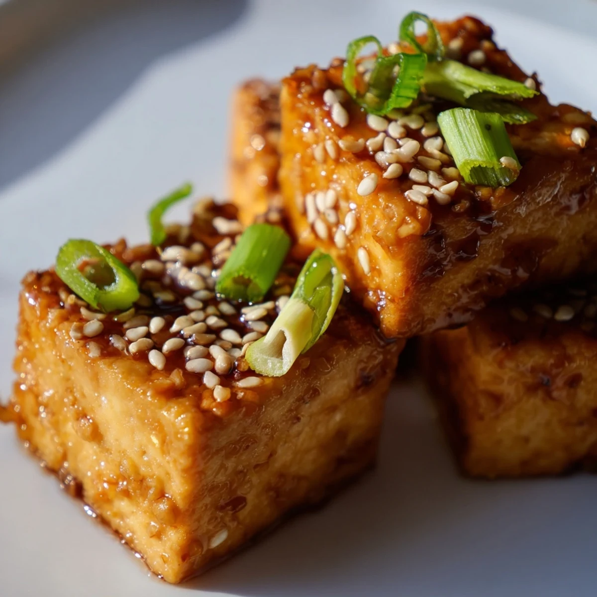 This dish features tofu pressed and cut into cubes, marinated briefly in soy sauce, then coated with sesame oil, garlic powder, and cornstarch. The cubes are air-fried until golden and crispy, delivering a satisfying texture with minimal oil. Meanwhile, a rich soy glaze combining maple syrup, rice vinegar, garlic, and ginger is simmered until thickened. The glaze is then drizzled over the tofu, enhancing each bite with a balanced savory and sweet flavor. Garnished with sesame seeds and spring onions, this versatile dish can be enjoyed as a snack, appetizer, or paired with steamed rice or noodles for a wholesome meal.