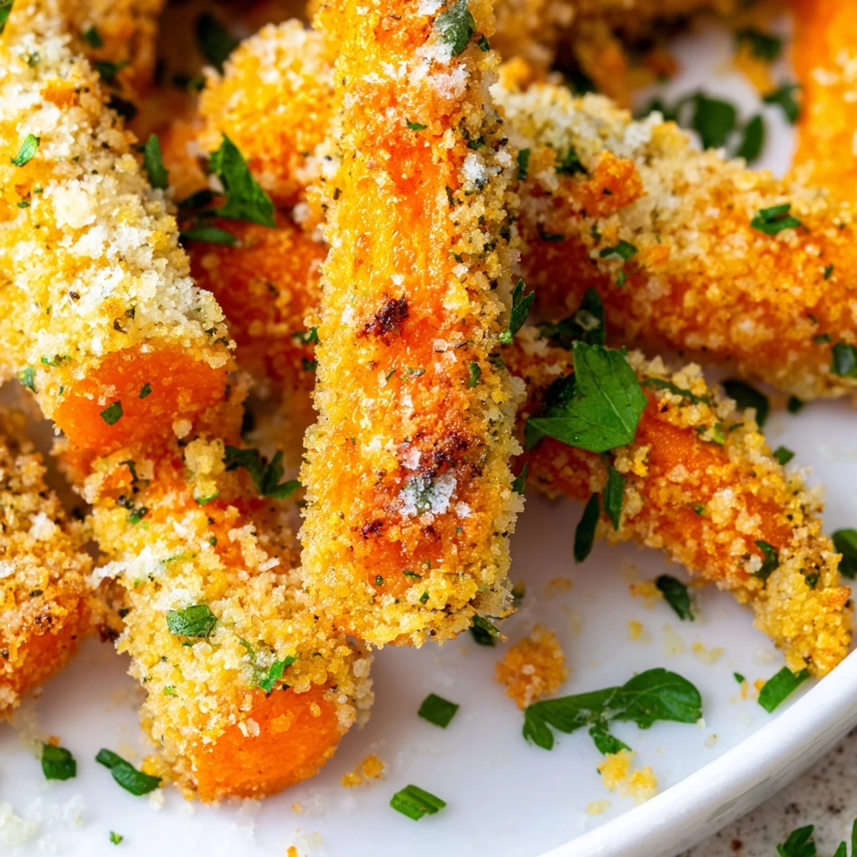 These roasted carrots transform into something special with a savory Parmesan and herb coating. The vegetable sticks get tossed in olive oil, then rolled in a mixture of grated Parmesan, panko breadcrumbs, garlic powder, and Italian herbs before roasting at high heat.