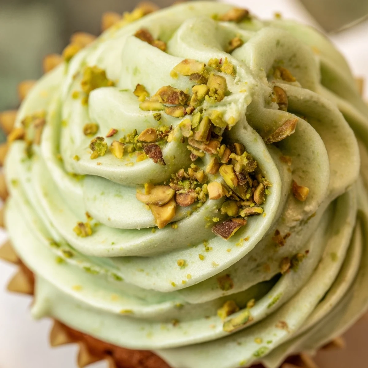 - Pipe or spread the buttercream onto the cooled cupcakes. Sprinkle with the reserved ground pistachios for that final touch.
