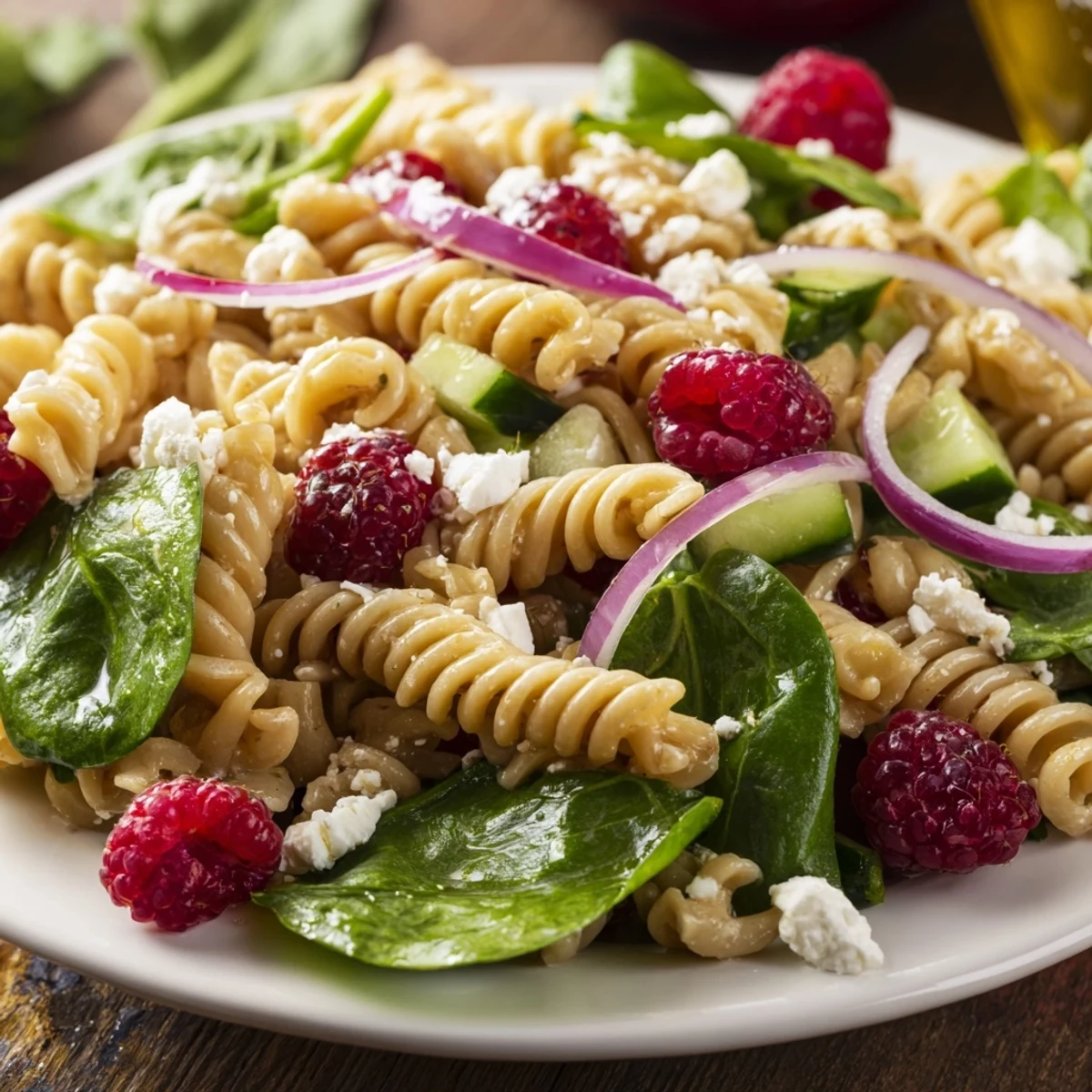 - In a large bowl, toss cooled pasta with spinach, onion, cucumber and half the raspberries