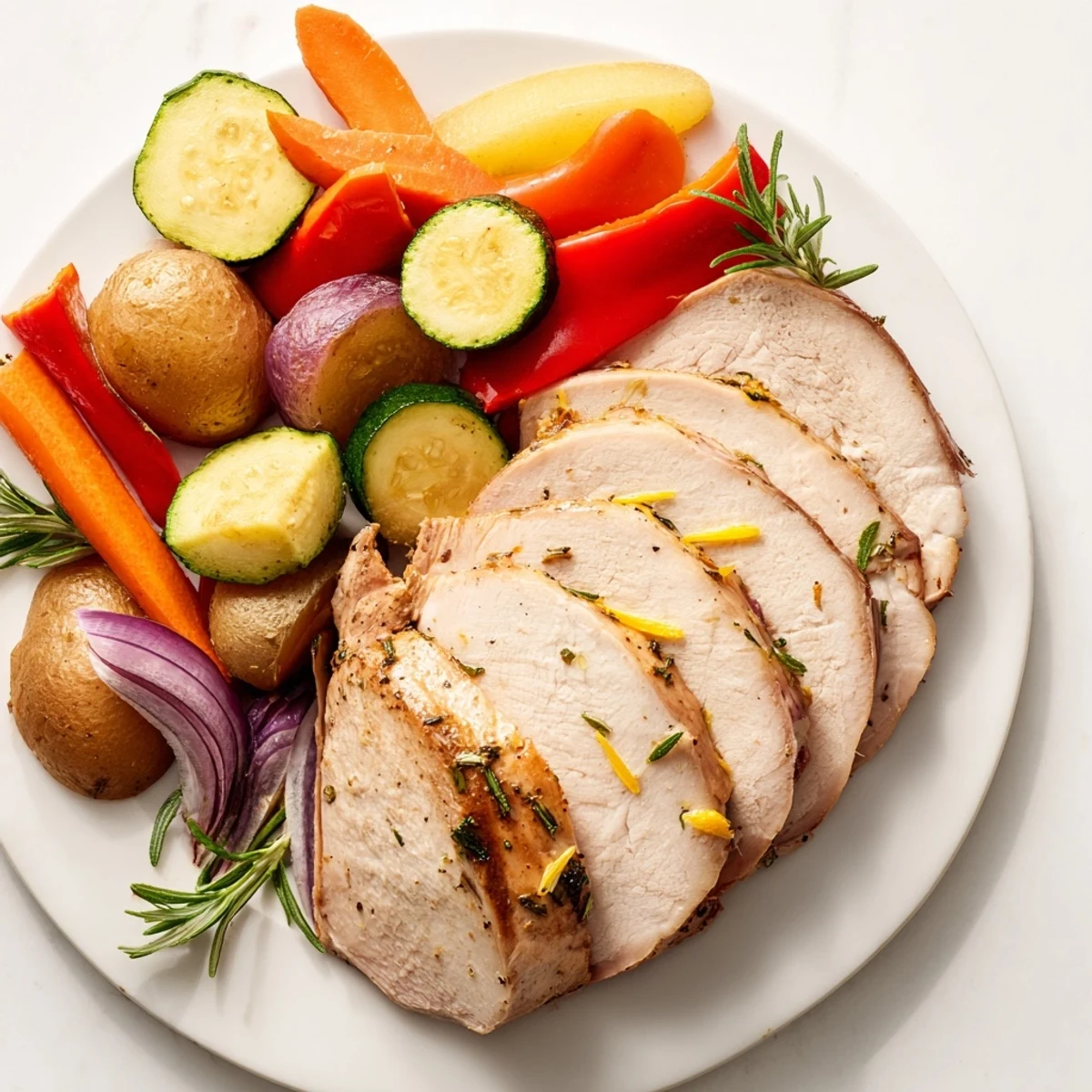 - Pull the pan out, loosely tent the turkey with foil, and let it rest for 5 to 10 minutes before slicing, which lets the juices settle back into the meat. Slice, serve with those golden roasted vegetables, and finish with a sprinkle of extra lemon zest or fresh herbs if you want to be fancy about it.